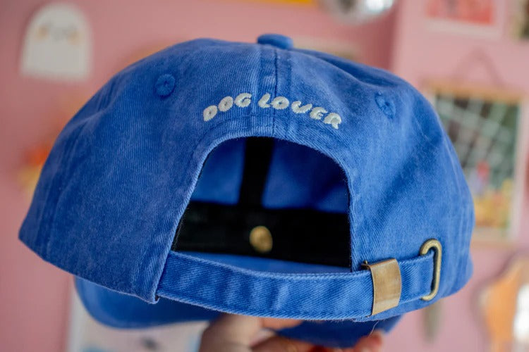 Blue hat with metal hardware featuring a Corn Dog on the front and the words "dog lover" on the back.