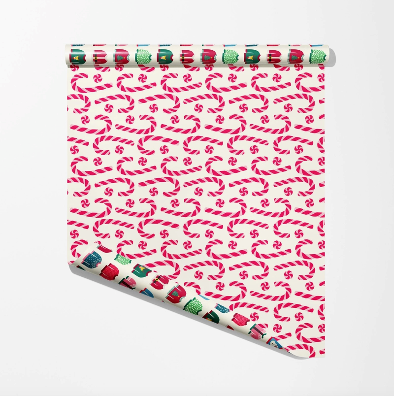 * 3 Sheets of Double-Sided Wrapping Paper * 20" x 29" Sheets * 70lb Opaque Paper * Printed in the USA. * Packaged in cello sleeve with product label. As this paper is double sided, we will ship your rolls with an even split of both designs facing outward. (For example, if buying four rolls, we will ship two rolls with Side A facing outward, and two rolls with Side B facing outward. Testers for double sided wrapping paper are sent as a single sheet of paper and will be rolled with any other testers that are part of your order. Sweet meets silly with our Sweaters & Candy Canes double-sided wrapping paper. One side features a playful scatter of red and pink candy canes and starlight mints on a warm cream background—festive and full of sugary charm. The reverse side brings holiday humor with a collection of quirky illustrated "ugly" Christmas sweaters, from snowflakes and reindeer to Christmas trees, polka dots, and a Santa suit.
