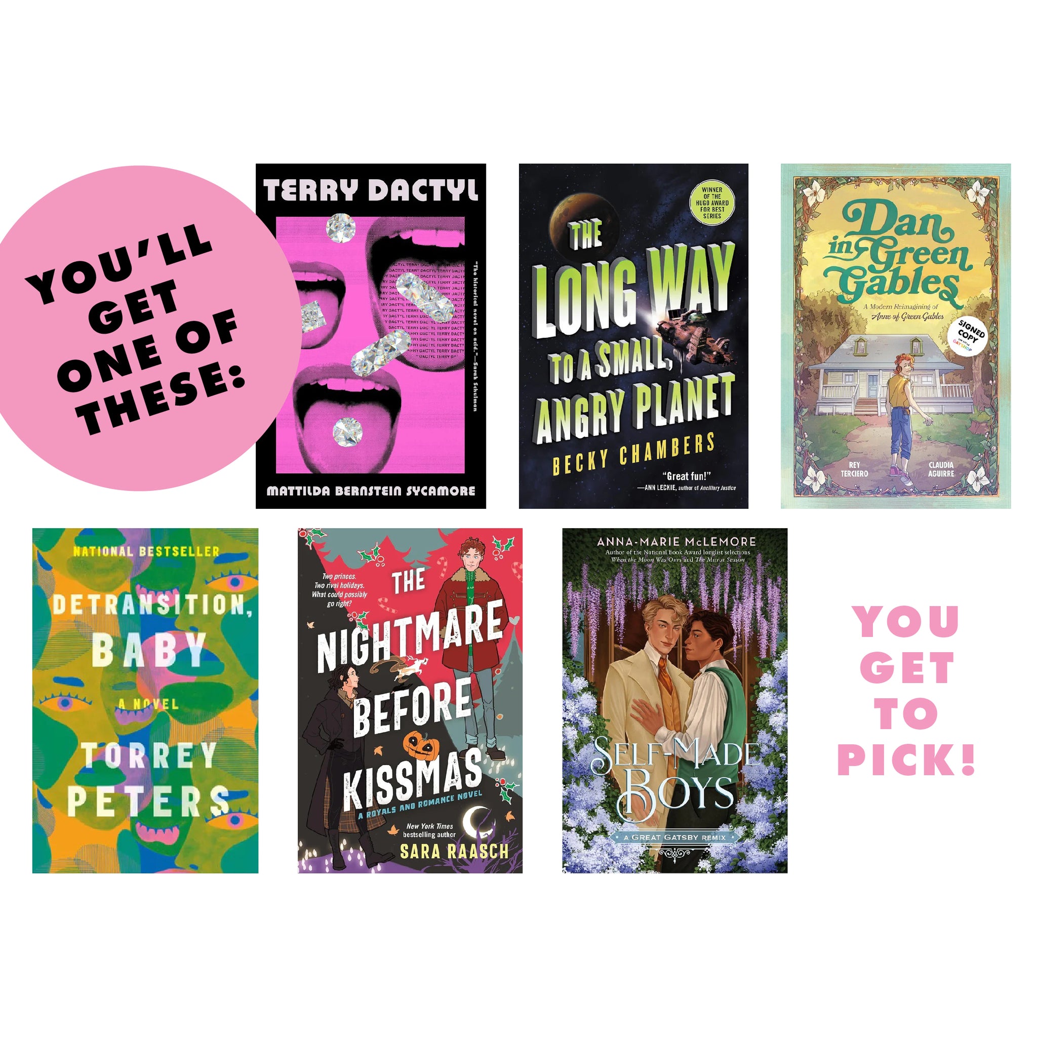 Every month, you get to pick a selection from our Little Gay Book Club, and get that, plus cute additional swag items (ranging from $30-$50) from independent queer artists and makers shipped right to you.